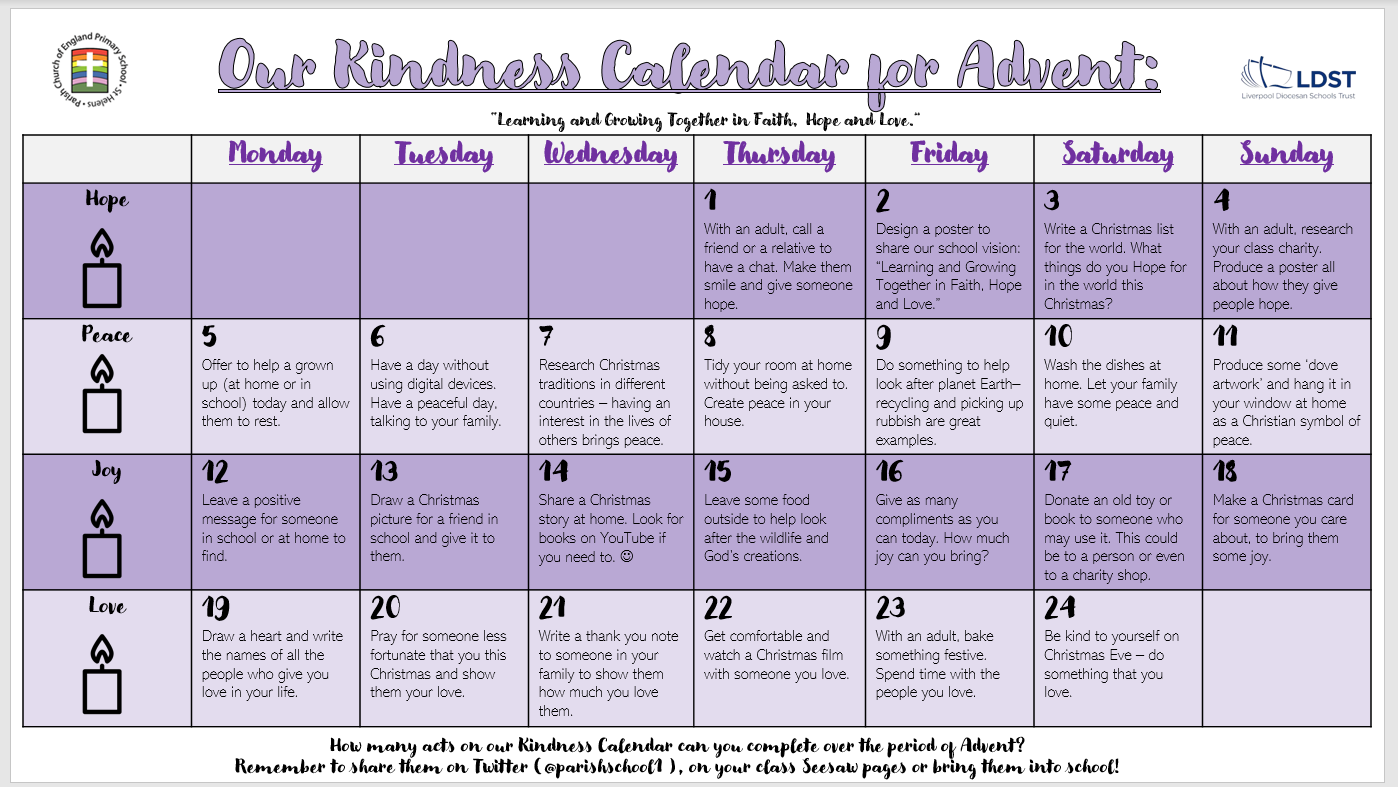 As a school, we also complete different incidental acts of courageous advocacy across the year in line with the Christian Calendar. This includes our 'Kindness Calendar' for advent: